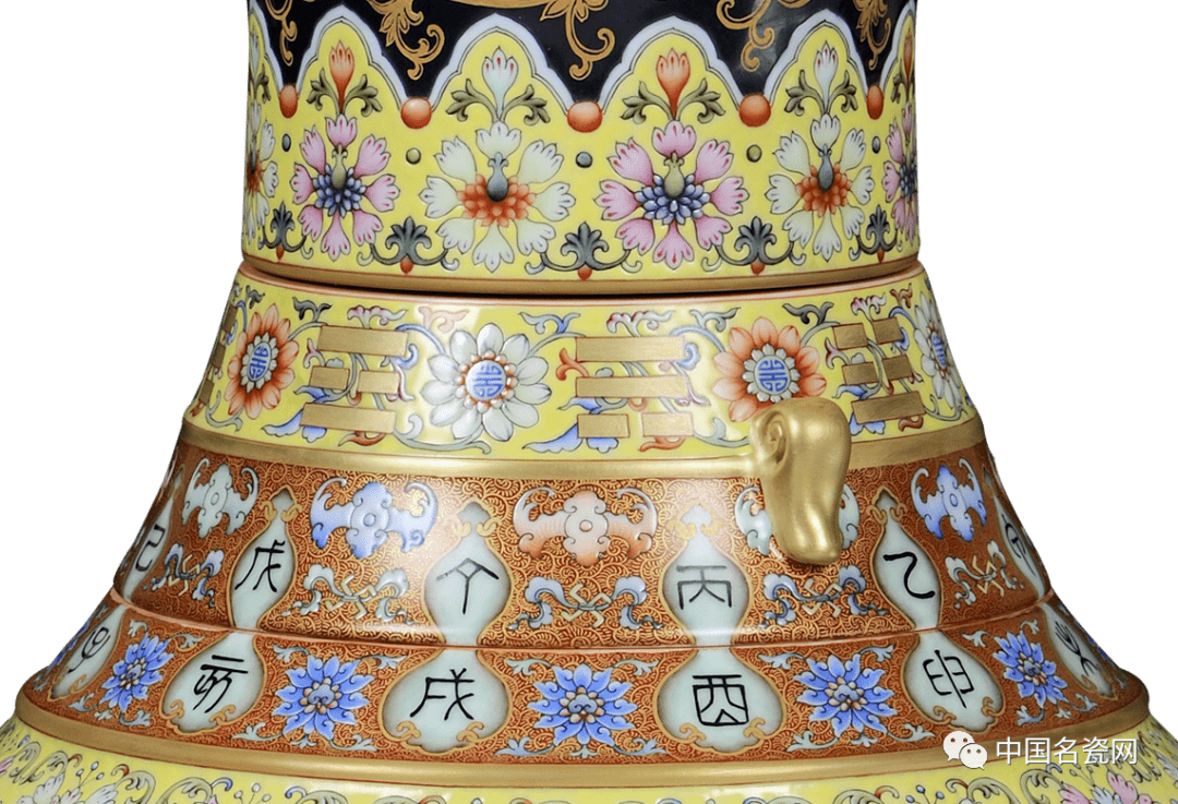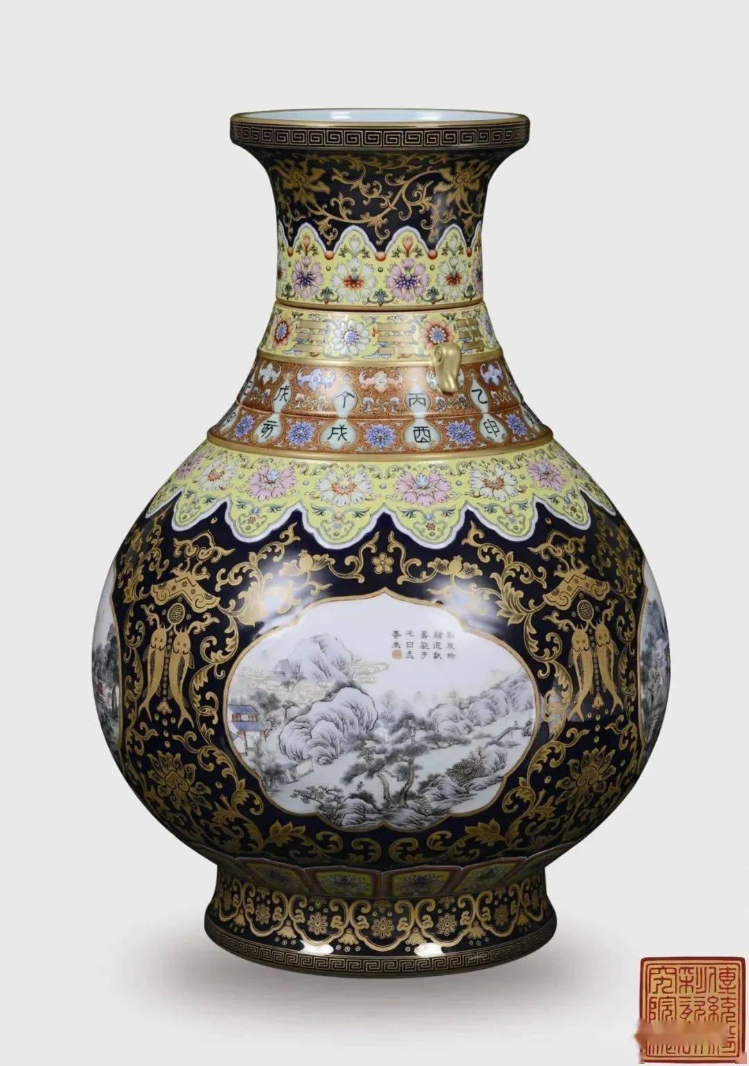 该件由景德镇市传统粉彩瓷研究院倾全院之力成功复烧。瓶身通体满绘各式精美纹饰,腹部四面海棠式开光,开光内均为白地绘不同画面,有舟船竞渡、圆明园景色等,上方再以墨彩书与画面相应的乾隆御制诗句。工艺之繁复,实为《陶雅》所称之“华缛极矣,精巧之致,几于鬼斧神工。”令人叹为观止。
