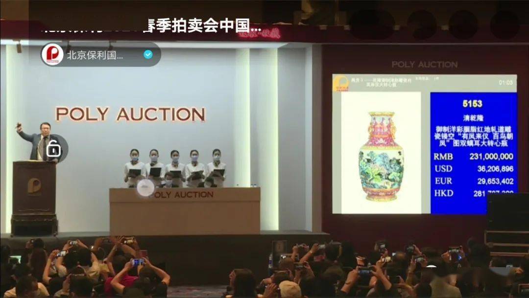 6月8日1点03分,北京保利春拍夜场,万众期待的市场可见尺寸最大的转心瓶——御制洋彩(粉彩)胭脂红地轧道雕瓷镂空「有凤来仪百鸟朝凤」图双螭耳大转心瓶,经过现场、电话委托的长时间激烈竞价,最终以231,000,000元成交!合算佣金高达265,650,000元。这已打破2019年 9200万成交的乾隆御制洋彩「时时报喜」双龙耳转心瓶,成为全球最贵转心瓶。