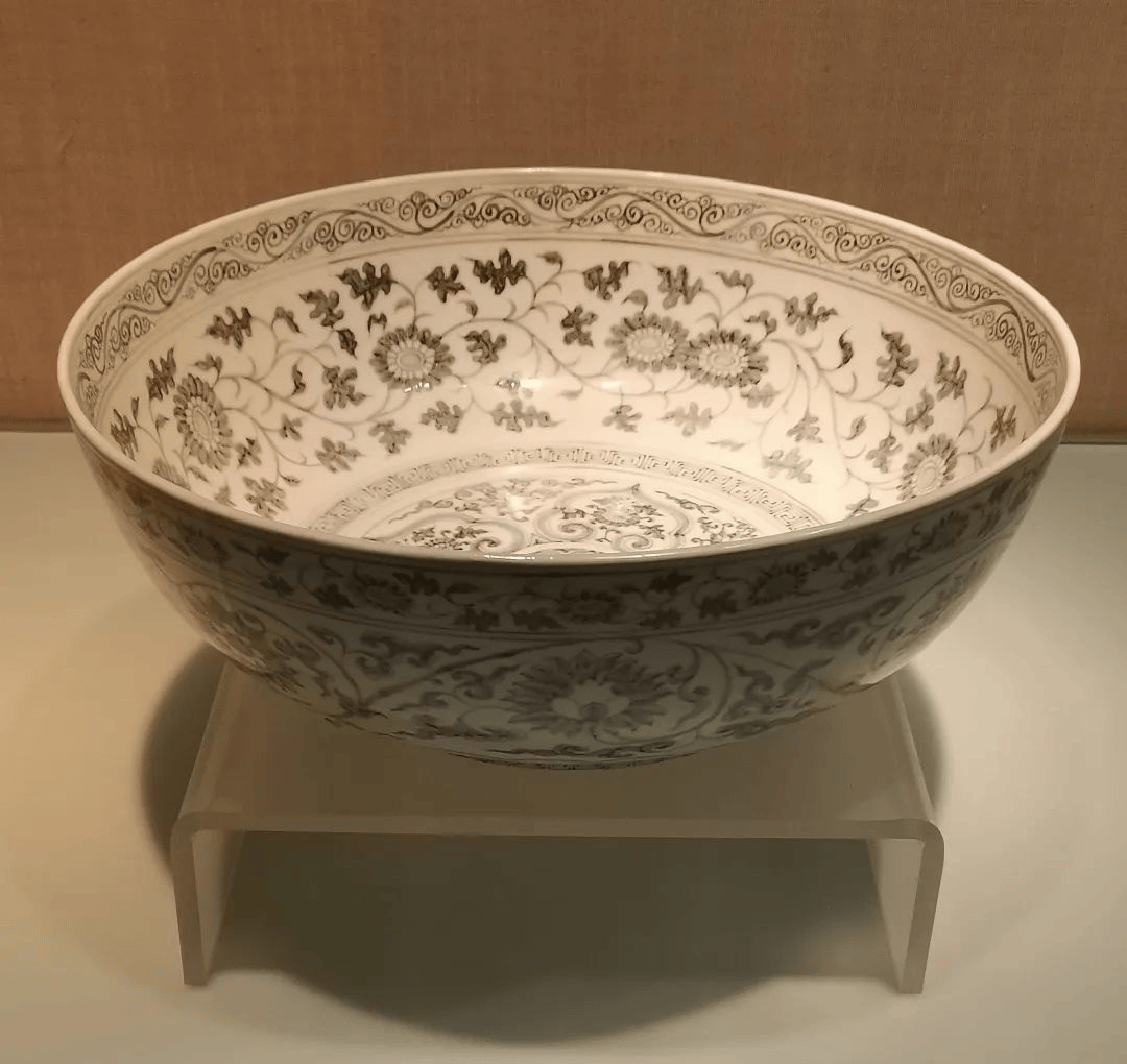 值得注意的是,洪武时期的折枝或缠枝莲纹多呈螺丝状,与元代常见的葫芦状缠枝莲纹形成鲜明对比。同时,元代瓷器上的大叶纹饰在洪武时期也明显缩小,不再出现。此外,瓷器图案的布局也渐趋疏朗,开始摆脱元代装饰多层次、满花纹的风格。