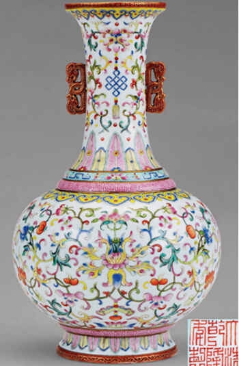 在用彩方面,乾隆粉彩经常利用粉彩温润柔和的质感造出不同的色泽层次和透视关系,所以能够精准细致地仿制出石,木,动物等物体的色调和质感。乾隆粉彩装饰另一引人注目的地方是大量采用缠枝宝相花和洋花作为纹饰主题,并加以夔龙,夔凤,鸳鸯,蝙蝠,八吉祥,暗八仙等等寓意吉祥的图案。这种含蓄的表现手法,在结合千姿百态的造型,使得乾隆粉彩瓷器显得繁缛华丽,精细完美。本件粉彩宝相花蛟龙耳瓶就是融合了这一时期各中工艺于一身的典型代表。