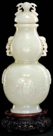 此瓶取整块上等和田玉料制成,取葫芦瑞物为形,侈口,束腰鼓腹,底足高深外撇,器形硕大,丰润饱满,掏膛匀净,雕工精细。瓶盖饰如意耳,刻有团寿纹样,耳上套活环,细腻精巧。瓶身通体浅浮雕枝蔓花叶纹饰,枝叶茂盛,婉转舒展,重迭交错,画意工整流畅。瓶外壁上部以浅浮雕精琢“大吉”二字,两侧出耳,以硕大蝙蝠衔磬,祥蝠振翅,福临喜庆。下部浮雕开光“囍”字,接连玉磬纹饰,两侧高浮雕以“寿”字,寓意喜上加喜,福寿连年,万寿无疆,永无穷尽,彰显帝王尊贵。