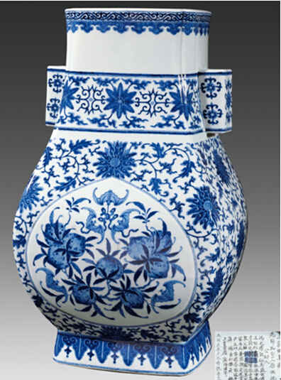 器长方口,直颈,溜肩,扁鼓腹,长方圈足,内书“大清乾隆年制”六字三行青花篆书款。器身通体青花纹饰,口沿下绘海水浪花纹和如意瑛珞纹一周,颈部饰有浪花纹的双贯耳和仰仰覆缠枝莲纹一周,腹部以团寿字纹为莲心的缠枝莲纹为地,于两面凸起的杏元状开光内绘五只蝙蝠和三组寿桃纹,足墙绘海水浪花纹。其中桃意指“寿”,蝙蝠意指“福”,因而其图案寓意为五福捧寿,而每朵莲花的花心均以寿字纹代替。此种图样非常少见,应是景德镇御窑厂为乾隆皇帝祝寿而特意烧造出来的。