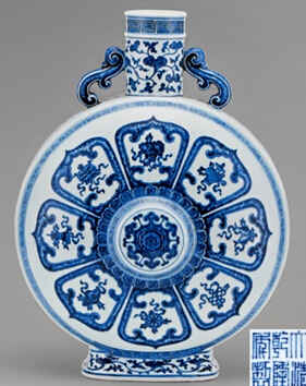 此瓶直口,粗颈,扁圆腹,下置椭圆形圈足。颈肩饰双耳,又称云耳腹部两面中心有圆状凸起。通体青花装饰,口沿处为回纹,颈部为缠枝花,腹部两面绘回纹一周,中心为朵花纹,外环以莲瓣纹内绘轮、螺、伞、盖、花、罐、鱼、肠、八吉祥纹,腹侧绘缠枝莲纹,外底青花书“大清乾隆年制”六字三行篆书款。