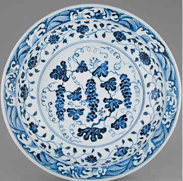 永乐时期青花纹饰最常见到的是缠枝、折枝形态的花卉、瑞果,有莲花、牡丹、茶花、石榴、荔枝、枇杷等。这些纹饰经常出现在大盘、碗、梅瓶、执壶上。花果纹饰写实传神,充分借鉴国画的笔墨意韵,得其法度,勾、勒、点、染诸法,运用皆宜。线条粗细并用,青料浓淡兼施,从而令画面富具苍翠欲滴的意趣,透出凝重雄浑之美,一如朱明盛世,威加四海之气势。