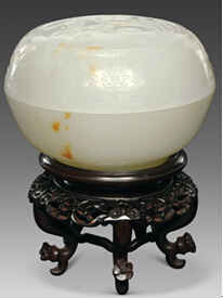 捧盒圆形,白玉玉料硕大,坚实细密,莹白透亮,带星点洒金皮。器成盖盒状,一剖为二,鼓膛腹,上下微收,圆口,环足,子母扣纹丝吻合。