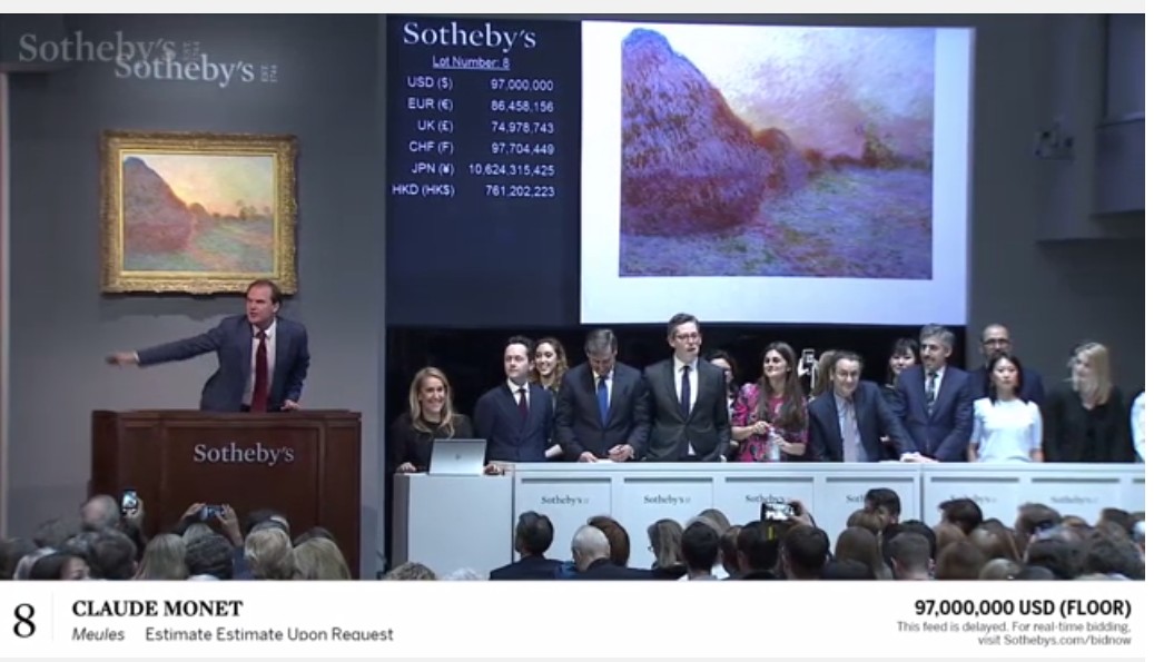(雅昌艺术网讯)当地时间5月14日晚,纽约苏富比“印象派及现代艺术”晚拍举槌,共呈现56件拍品。其中,备受瞩目的莫奈(Claude Monet,1840-1926)经典作品《干草堆》以咨询价(预计5500万美元)形式上拍。从4500万美元起拍后,《干草堆》随即收到超过6个电话和数位现场买家应价,在加价至8000万美元后,竞争者只剩苏富比印象派和现代艺术部门的全球负责人海伦娜·纽曼(Helena Newman)的电话委托和一位现场买家。经过长达10分钟犬牙交错交替加价后,现场买家展现出更强的购买决心,以9700万美元赢得对这件莫奈名作的竞争。加佣金1.1亿美元(折合人民币7.6亿元),创造了莫奈作品拍卖的新纪录,也是莫奈作品首次跻身1亿美元俱乐部。(此前纪录为2018年5月,由《绽放的睡莲》8468.5万美元保持。)