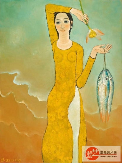 越南艺术家阮忠则将女性升华为歌颂故乡的载体。艺术家以仰视的视角出发,在《夏夜》中描绘出一位气质清丽的女子。她手持象征越南一方水土的莲花和鱼,在欧洲理想主义画风地渲染下展现出越南女性的优雅与妩媚。渐变、晕染开的抽象背景,与细腻的人物描述形成了鲜明的对比,温暖的颜色使得人物真实又颇具象征意味。