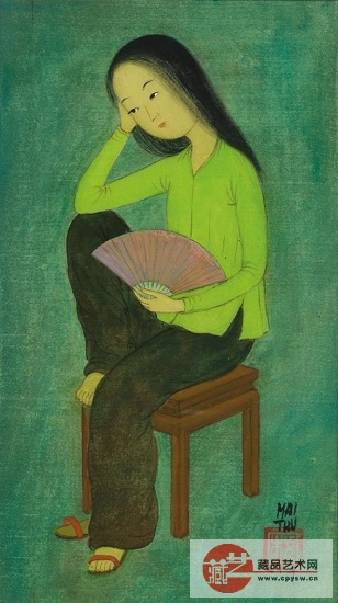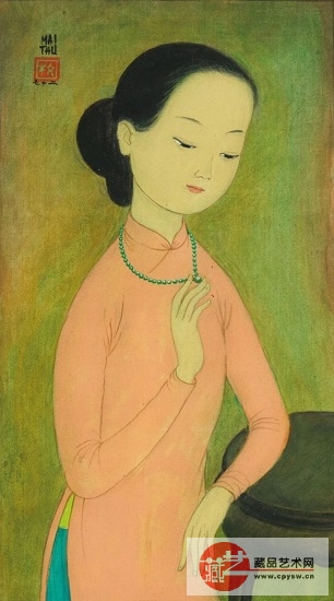 对于女性的描绘成为了旅法越南画家梅忠恕画笔下对越南传统文化以及民间情怀的赞颂。艺术家钟情以水粉、水墨在丝绢上描摹女性的柔情万种。在《愁绪》和《玉石珠链》的画面中,画家以细腻的笔触展现他眼中越南女性柔情似水的温婉之美;画中的女子们神情含蓄,满头浓密柔顺的青丝搭配清丽淡雅的衣着,无不彰显着越南传统审美中对女性美的定义。