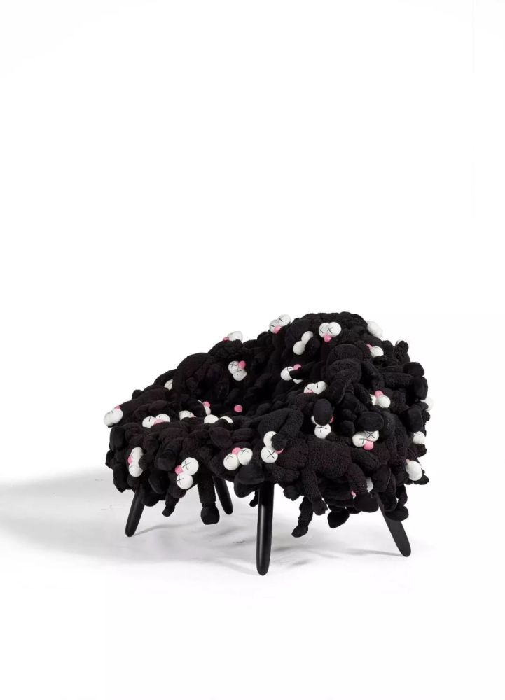 将于“HI-LITE”专拍上亮相的《KAWS 黑椅》是KAWS与巴西圣保罗艺术兄弟档阿贝托及费纳多·坎帕纳(Humberto & Fernando Campana)携手完成的创作。坎帕纳兄弟最为人称道之处,在于他们长于使用每日可见、再也寻常不过的材料,透过出人意外的组合方式做出优美繁复的家具。尽管KAWS和坎帕纳兄弟档的合作一开始令人诧异不已,但是这样的“艺术冒险”的最终成果令人赞叹。