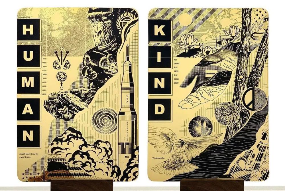 写着HUMAN的一面画着掌握核裂变的猿猴,象征力量的火箭和巨浪;写着KIND的一面则是和平鸽,伸出的手,一棵树和几朵花。每一个作品还配有一个保护套,上面印有艺术家的声明和对宇航员的致谢。