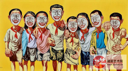 画面中,模式化的白色面具掩盖了画中人物的真实表情,超出身体正常比例的双手勾连彼此,看似热情却又显刻意。用艺术家本人的话来说,“我把它画得特别灿烂,就像舞台上的一种布景,人们都在自我安慰,似乎等着谁来拍照。包括他们的肢体语言和手,都仿佛带有一种假装出来的、得意的城里人的姿态。”