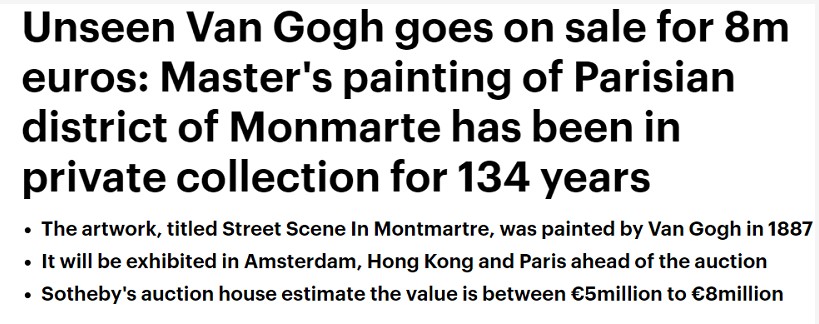 据英媒《每日邮报》2月27日报道,梵高一未公开画作被私人收藏134年后,或将以6200万元在苏富比拍卖行进行拍卖。据悉,这幅名为《蒙马特街景》(Street Scene In Montmartre)的画作由梵高(Van Gogh)于1887年创作,将在阿姆斯特丹、香港和巴黎展出,之后将在苏富比拍卖行(Sotheby's auction house)预计估值500万至800万欧元(约3900万-6200万元人民币)进行拍卖。