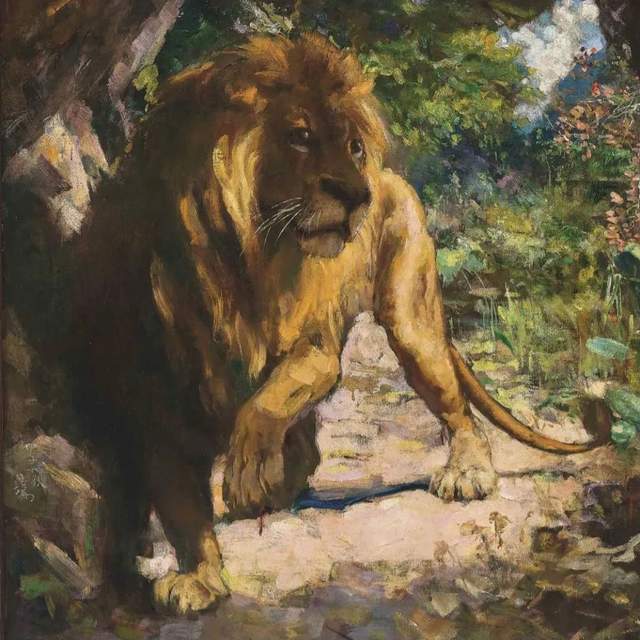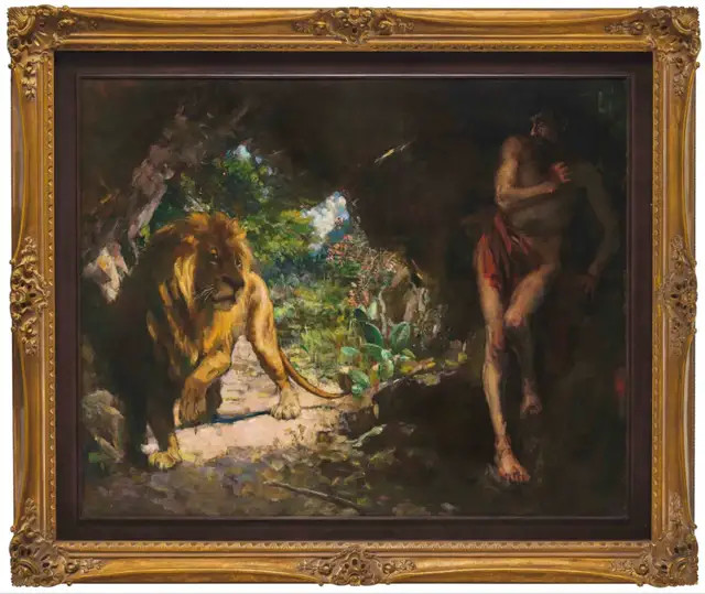 徐悲鸿(1895-1953) 《奴隶与狮》 油彩 画布 123.3 x 152.8 cm. 1924年作 款识:悲鸿 甲子初秋(左下) 估价: 港元 350,000,000 - 450,000,000