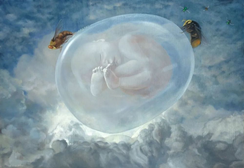 方力钧是二十世纪九十年代中国新艺术潮流中的代表人物,他与志同道合的艺术家们共同创造了一种戏谑、幽默与荒诞的艺术风格——玩世现实主义,用一种百无聊赖、泼皮幽默的方式,来呈现个体真实的生存状况和精神世界。作为成长于八十年代的艺术家,改革开放的持续推进以及西方现代艺术的不断普及让方力钧在精神与心理上都得到了极大的解放,而“像野狗一样生存”也成为了艺术家为人、从艺的座右铭。在挣扎、困顿的现实生活的洗礼下,方力钧逐渐形成了自己独特的艺术观念与路径——以一种玩世不恭的无所谓状态直面人生的无常与个体的脆弱。从绘画语言上看,方力钧似乎与超现实主义有着某种精神联系,即用漫无边际的想象力去呈现世界的荒诞性,并以精湛的写实技术使幻象具有真实性。然而与超现实主义的精神旨归不同的是,方力钧的作品在华丽的视觉表征之下隐含着深刻的社会批判性。方力钧用各种奇怪的符号,不合逻辑的陈列方式,以及鲜艳明亮的色彩架构起一个独特的个人精神世界。在这里,画家不是为了描绘美与和谐,而是通过象征性和隐喻性的虚拟人物与符号,去影射社会秩序给人造成的困境以及人与人之间的复杂关系。