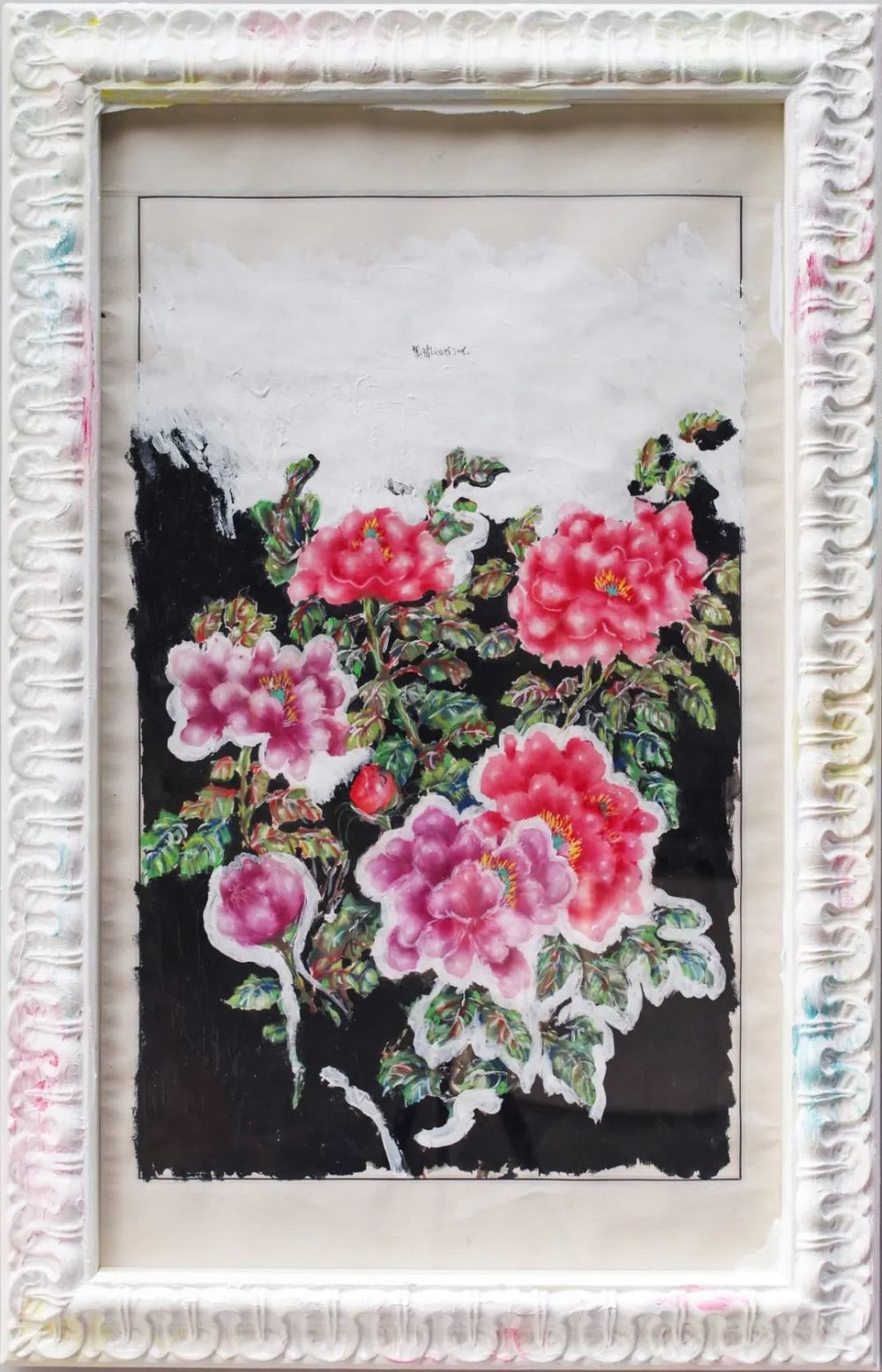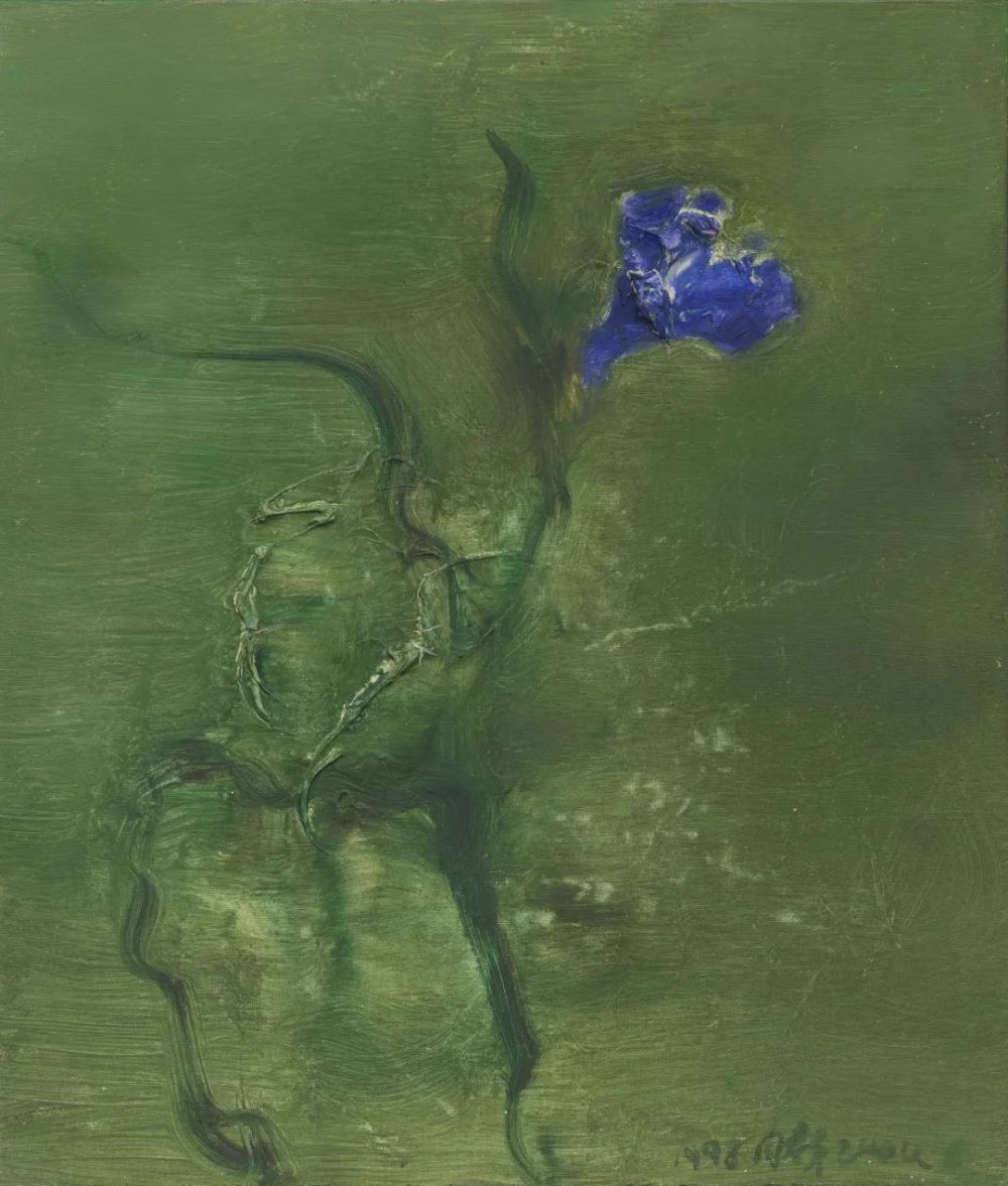 1989年初,周春芽从德国卡塞尔美术学院毕业后归国,在德国留学期间的见识使他对当代艺术的空间和可能性有了新的认识。此时的德国抽象表现主义盛行,其实不仅仅是德国,整个欧洲都处于新思潮新绘画的鼎盛时期,领先全球。周春芽在打开眼界的同时,作为一个中国艺术家也在不断探寻自己的根在哪里,一个中国艺术家该如何在世界上自立,这也促使他对中国传统文化艺术产生新的情感与理解 ,此件《花》创作于1998年,在有限的空间中颇具视觉冲击力,笔触流畅色彩深沉,东方特有的节制之下是周春芽强烈表达欲望的底色,是艺术家与生俱来的对绘画本身的敬畏和思考 。