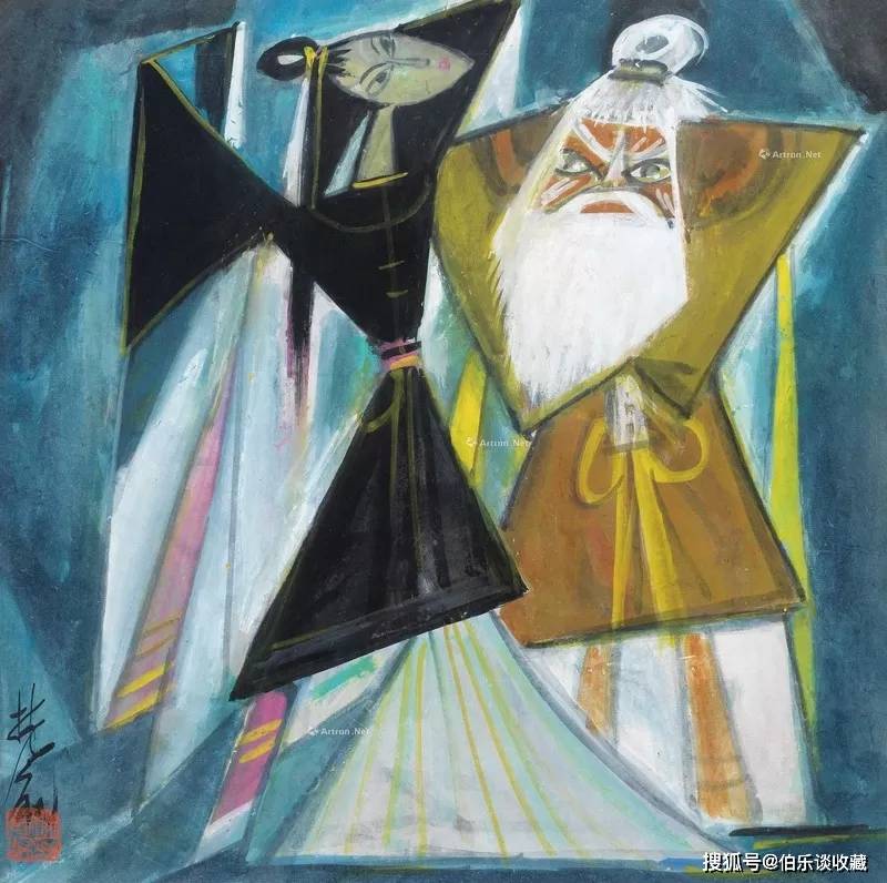 林风眠定居香港后的代表性创作《南天门》现场以322万元成交,作品凝聚其晚年艺术思考与人生感悟,延续了他早年对立体主义形体解构的探索,巧妙融合中国传统戏曲的叙事性与皮影、剪纸的装饰美感,以平涂着色的手法构建画面。三角形构图赋予人物灵动动势,蓝黑、白、黄三色的强烈对比形成鲜明视觉张力。曹福的白色胡须凸显忠义崇高,玉莲的黑裙暗藏柔中带刚之气,黄衫则隐喻守护与希望。彩墨交织间,背景暗夜中透出的光源包裹着人物,既暗含“善恶终有报”的故事寓意,更投射出艺术家历经风雨后,以艺术获得新生的生命体悟。