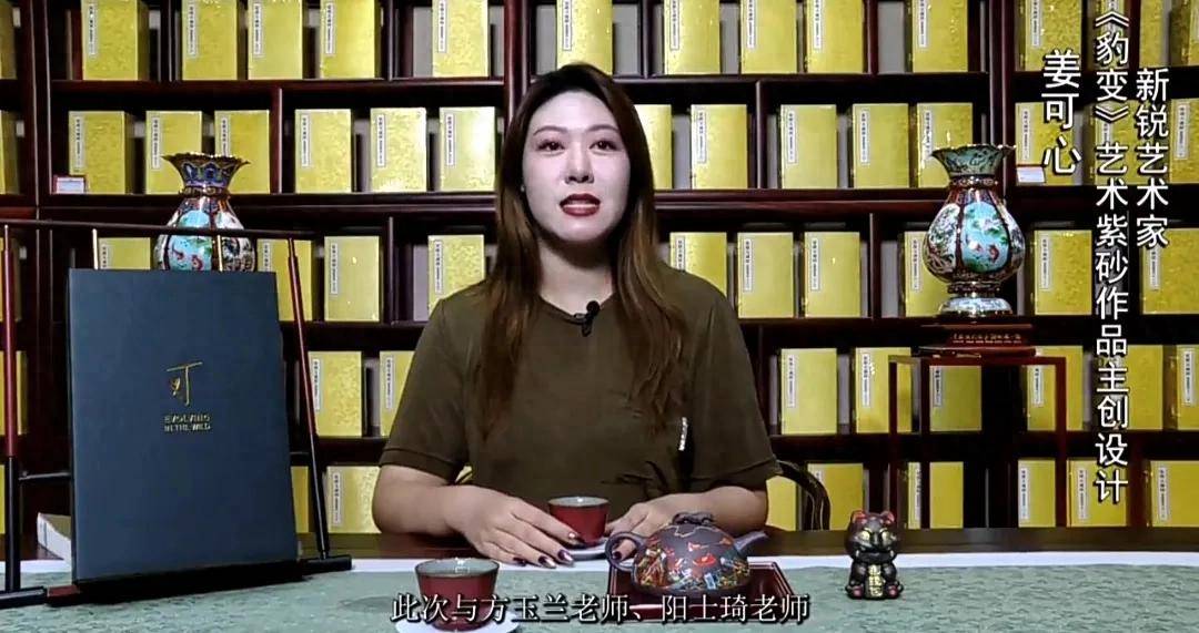 在向镜头问候之后,姜可心开始分享她与著名的高级工艺美术师方玉兰和景德镇的陶瓷文化传承人阳士琦共同创作的名为“豹变”的紫砂壶。她的语气温柔,给人一种书卷气的感觉,仿佛是从文学作品中走出来的人儿。