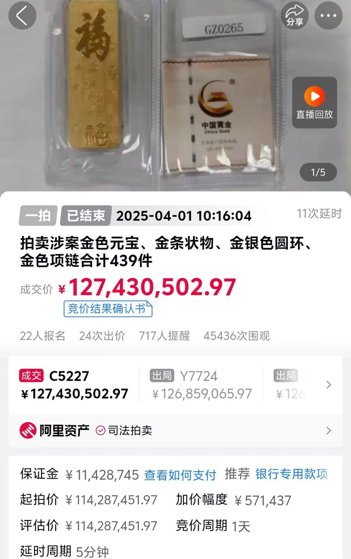 值得一提的是,日前,广州市中级人民法院委托拍卖行在司法拍卖平台上公开处置一批涉案黄金饰品,共计439件,包括金元宝、金条、金银色圆环、金色项链等,起拍价超1.1亿元。