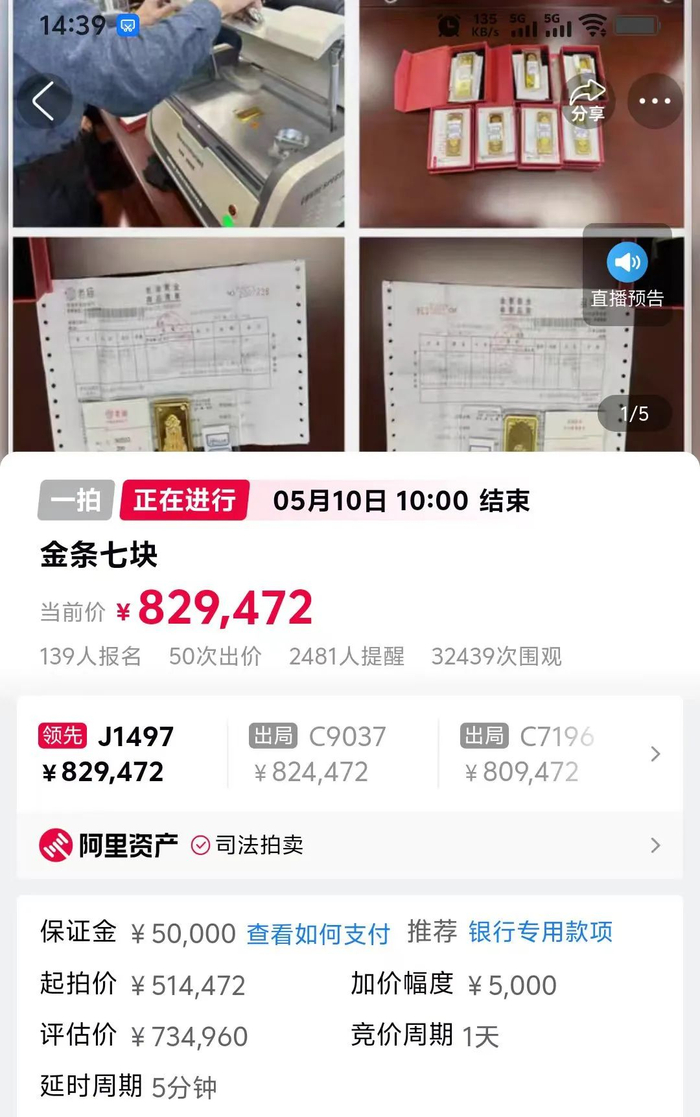 保真且存在明显价差的黄金自然吸引了用户参与,截至5月9日14时39分,共有139人报名,3.24万次围观,经过50次出价,拍卖价达到82.95万元。据此计算,平均每克黄金价格为829.47元。