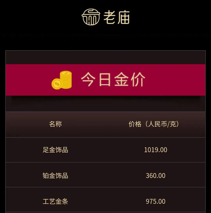 老庙黄金的今日(5月9日)金价显示,其工艺金条为975元/克,若参与者以每克830元买入则还便宜145元。