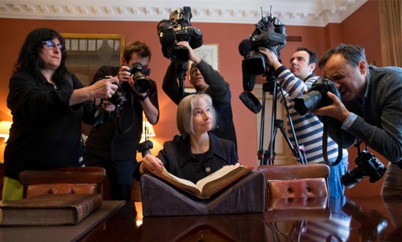 当地时间2016年4月19日,英国伦敦,佳士得拍卖行揭幕即将拍卖的莎士比亚作品,举行媒体预展。今年是莎士比亚去世400周年,作为纪念,佳士得拍卖行将于5月在伦敦拍卖4本17世纪出版的莎士比亚全集,其中包括极其珍贵的《第一对开本》。图为4月19日,伦敦,莎士比亚全集拍卖品被媒体拍摄。