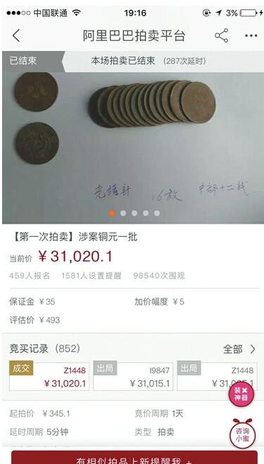 有人笑称,因为这两笔拍卖的每次增幅价只有4、5元,这一场拍下来,估计手腕子都得拍“酸”了。“能拍出过万的价格,我们执行法官也真的没想到!”济阳法院执行局执行一庭庭长杨名峰介绍,这次网上拍卖老赖的财产,之前曾做过评估,最初的起拍价也是依据评估做出的。但他同时也表示,毕竟通过阿里平台进行的网上拍卖,会面对全国甚至更广阔的买家,作为钱币等收藏品,爱好者趋之若鹜也是可以理解的。