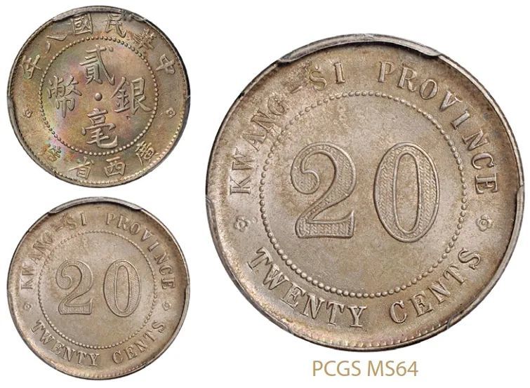 简介:民国八年广西省造贰毫银币一枚,英文“SI”版,Y-415a/LM-162,铸造精美,秋友晃旧藏,PCGS MS64,目前为该公司评级纪录第一名