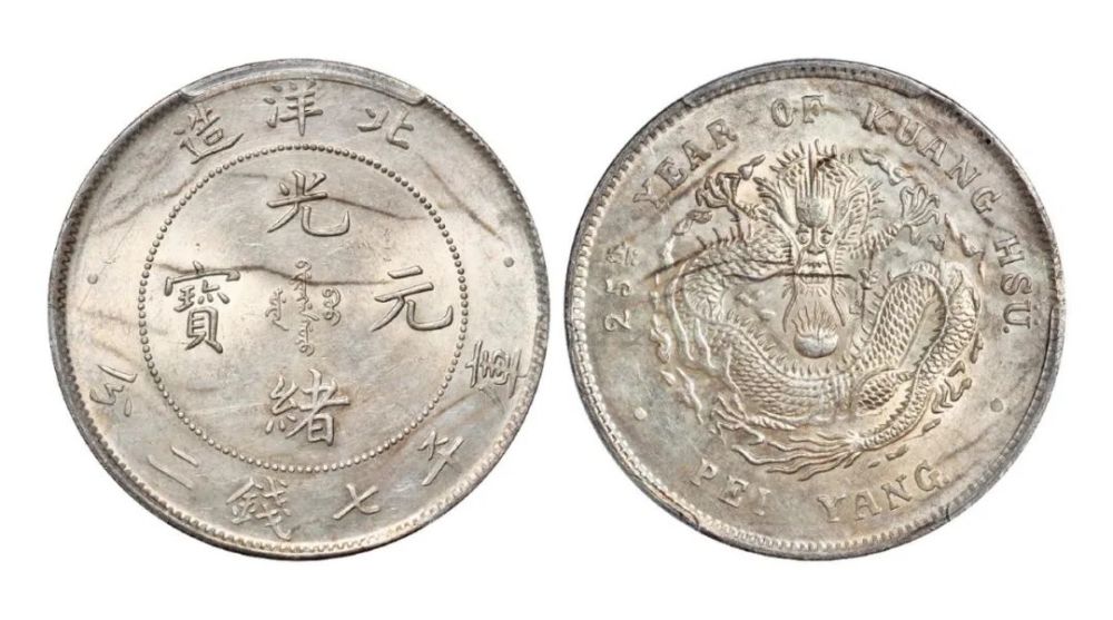 简介:光绪二十五年北洋造光绪元宝库平七钱二分银币一枚,Y-73/LM-454,钢模初打,规整深峻,版底螺旋铸纹清晰可见,龙鱗饱满,保存完美无暇,PCGS MS62