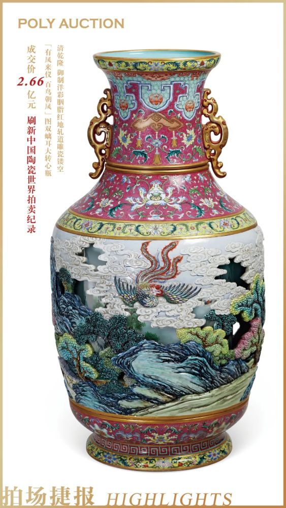 本次北京保利2021春拍上最大的焦点,当属这只清代乾隆「有凤来仪 百鸟朝凤」大转心瓶无疑,以高达2.66亿元的成交价强势登上热搜,同时也刷新了中国陶瓷世界拍卖纪录。