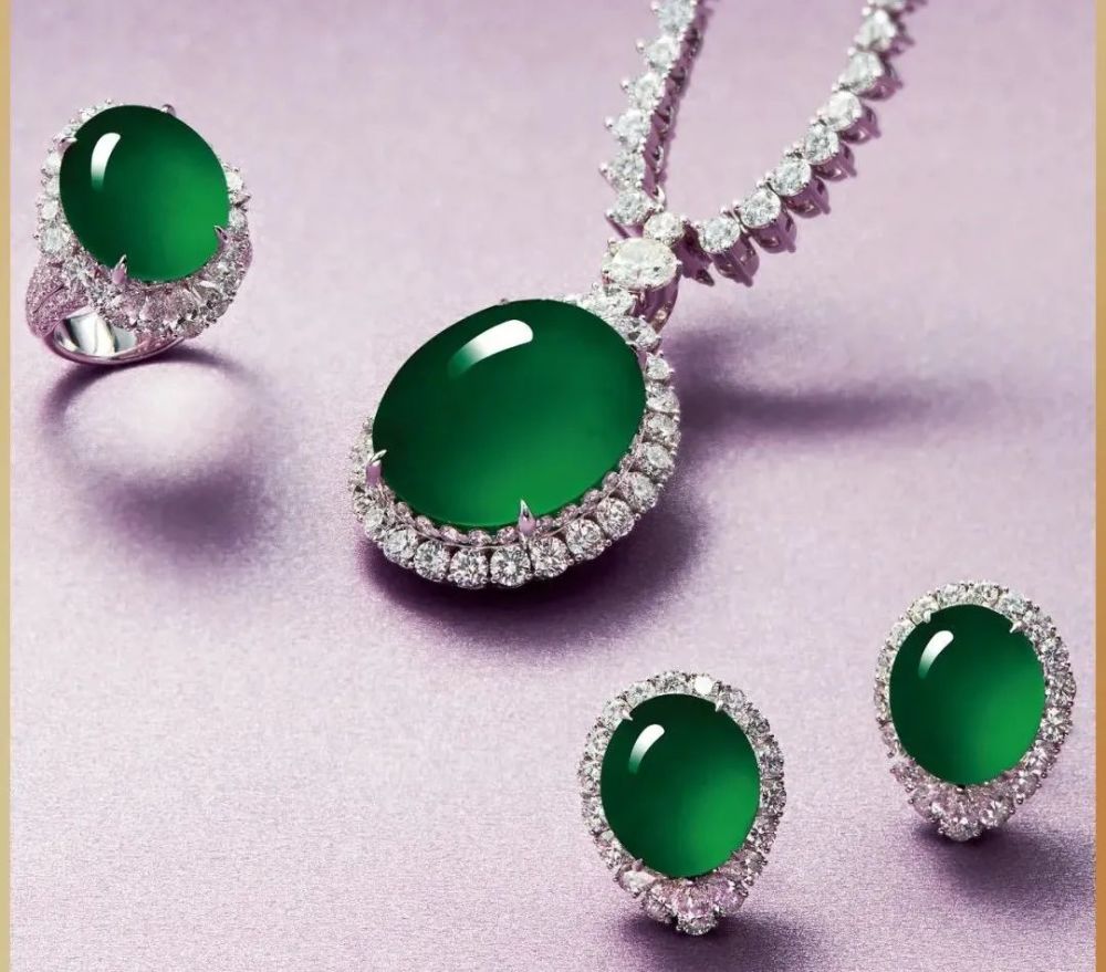 缅甸天然满绿翡翠蛋面配钻石项链、戒指及耳环套装