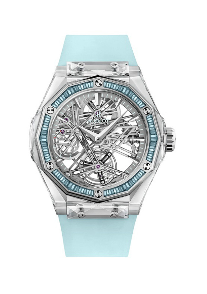 宇舶表(Hublot)携手雕刻艺术家Richard Orlinski,设计经典融合系列Orlinski Only Watch陀飞轮限量腕表,表圈镶嵌54颗长方型切割托帕石呼应主色调,标下此表的藏家还可获得与Richard Orlinski的见面机会。