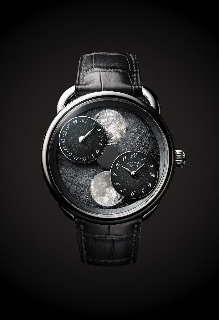 同样是月相,爱马仕Arceau系列特别推出L’heure de la lune ONLYWATCH月读时光特别版腕表,以独特的视角来观望月亮这颗地球的卫星: 同时显示北半球与南半球的月相盈亏。以陨石打造的表盘上,两个围绕盘面运转移动的显示时间的副表盘随着搭载于爱马仕自制机芯中 独创机制的节奏,显露出珍珠母贝精制的月相盘。