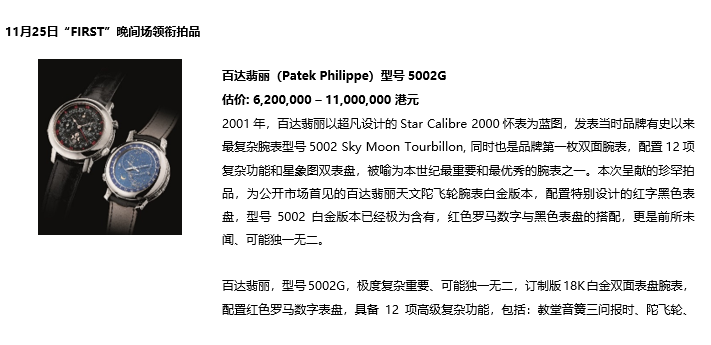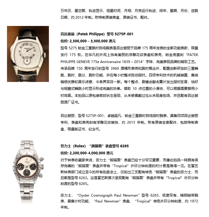 极度复杂重要、并可能独一无二的百达翡丽型号5002G白金腕表和极度罕有的劳力士“Pre-Daytona”型号6238,配黑色亮面表盘。同时,一系列经典百达翡丽“Nautilus”鹦鹉螺奢华运动腕表也为聚焦拍品。