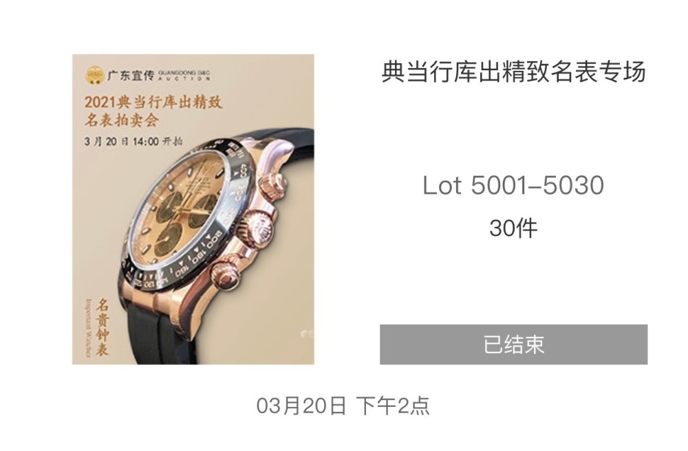 广东宜传拍卖,于2021年网络拍卖会中,首度推出精致名表拍卖专场,拍卖于3月20日圆满收官,承蒙各位的鼎力支持,现场、网络、电话、书面委托出价踊跃,经过近1个小时的激烈竞逐,此次名表拍卖专场拍出了好成绩,30块手表以百分百成交,圆满结拍,在此感谢各大平台鼎力支持。