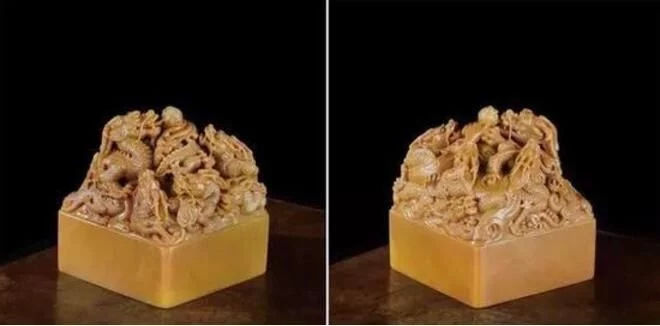 【年度最贵的田黄石--九龙戏珠钮章】看到上图这个栩栩如生的金黄玉玺就是大名鼎鼎的“九龙戏珠”,2017年12月3日晚,在北京匡时2017年秋拍“田帝玄黄--田黄石专场”上,寿山田黄石“九龙戏珠”经过激烈竞拍,最终以9500万元的拍价成交,加佣金约合1.09亿人民币,打破世界最贵田黄石拍卖纪录。之所以能拍出如此高价,是因为其集和了众多特质,包括正方印章巨大的体量,尚佳的质色,精美的雕工等等,并且这件田黄九龙玺是当代已知的最大田黄玺印。