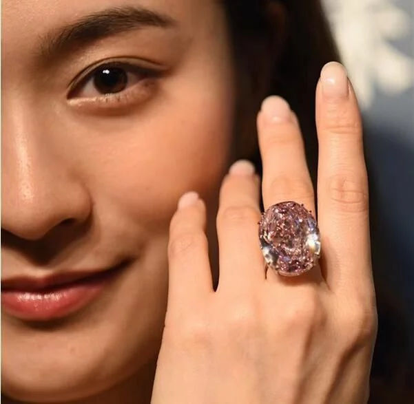 【世界拍卖史上最贵的钻石戒指--粉红之星】钻石一直是女士们的最爱,让我们再来看一下亮眼的钻石,在香港苏富比2017年春拍“瑰丽珠宝及翡翠”专场上,一颗重达59.60克拉的椭圆形内部无暇艳彩粉红钻(如上图)亮相,经过激烈的竞拍,最终以4.9亿港元落槌,加上佣金最终以5.53亿港元(折合人民币约4.76亿)成交,刷新了全球钻石的拍卖纪录。