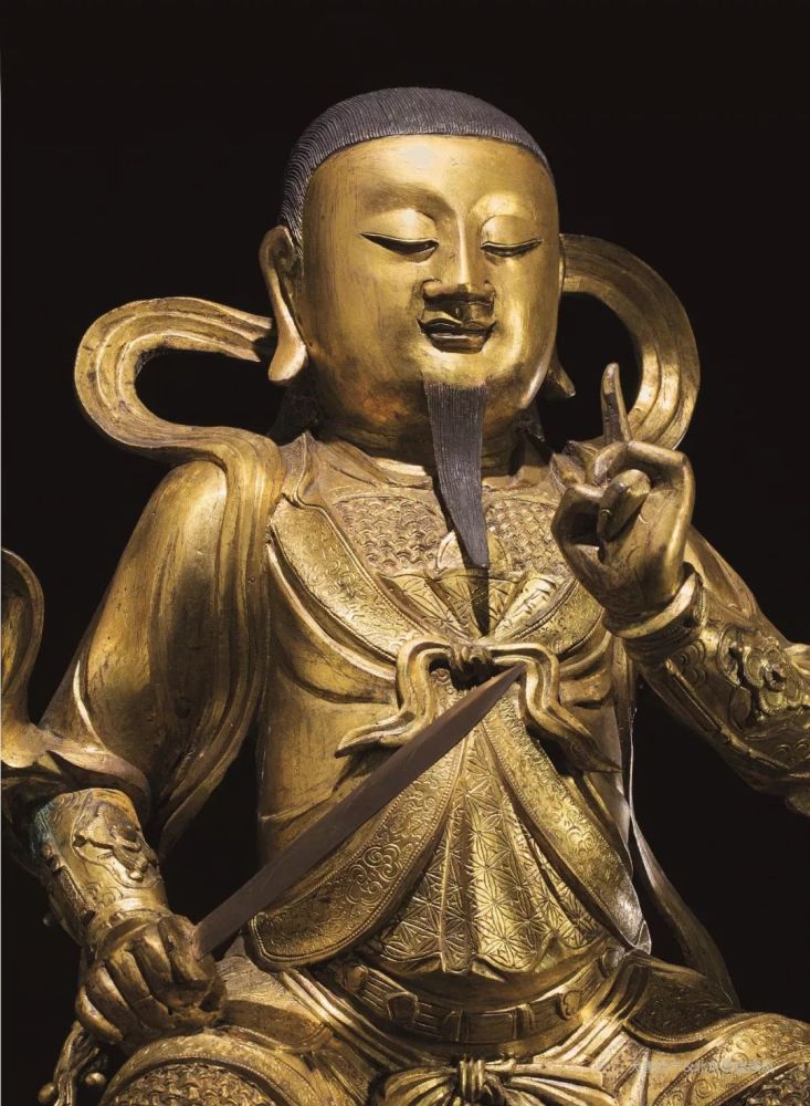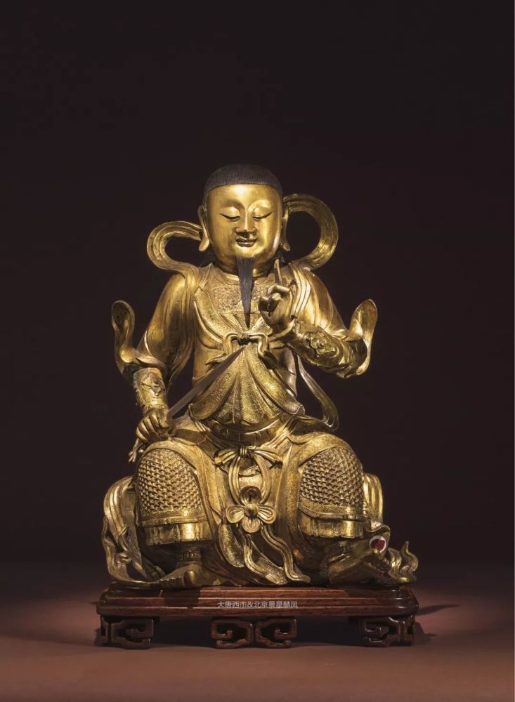 此尊坐像以铜为材,铸玄天上帝之姿,胎体厚重敦实,披发跣足,双脚下垂,颌下垂一缕长髯,长发披于脑后,皆为玄天上帝重要标志。面形方圆,双目半闭,发丝条条分明,须髯与长发经特殊工艺处理,漆黑而有光泽。右手持长剑,左手高抬,风空二指相捻成环形结印,身护铠甲,表示主掌兵戈之事,司权收服邪魔,威风必现;外罩长袍,衣缘雕饰如意云纹,刻画细致,衣纹流畅,双袖飞扬,周身飘逸丝绦环绕,虎虎生风。此尊造像器宇轩昂,看似正襟危坐,实则一脚微抬,配合半睁之双目,有凝神静思、蓄势待发之态,内涵如此者绝少。且通体鎏金光灿,实为鼎盛时期的作品,殊为难得。