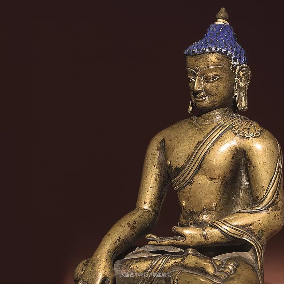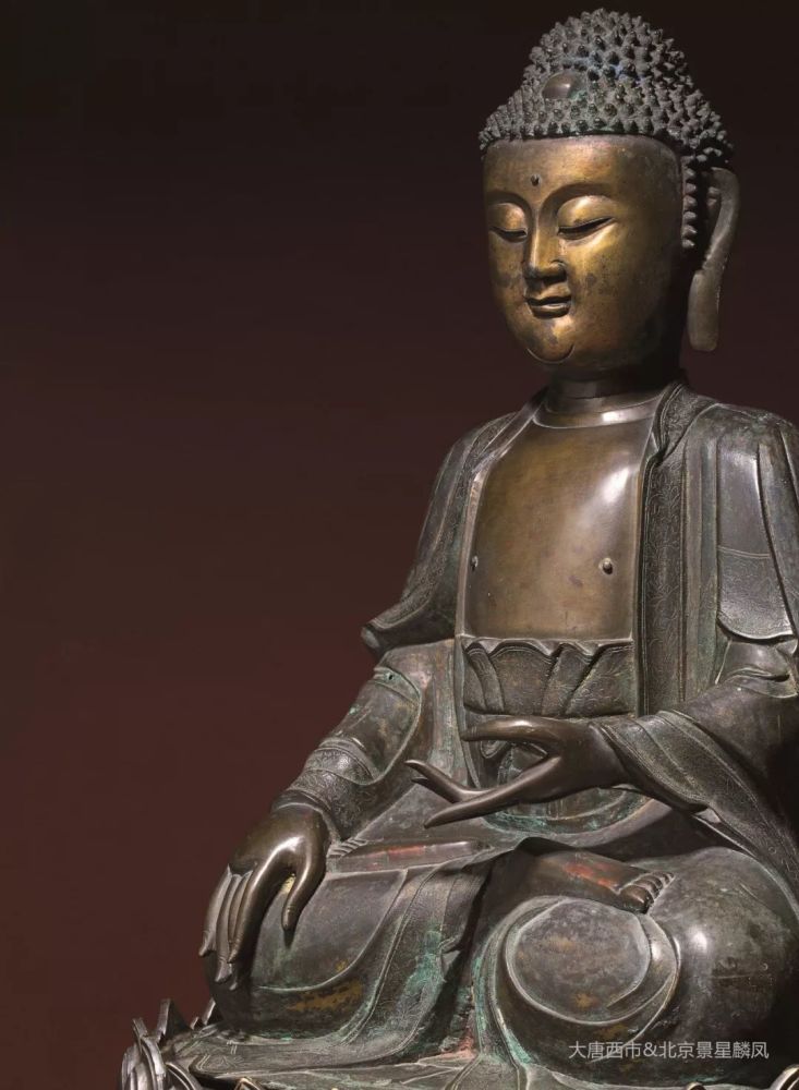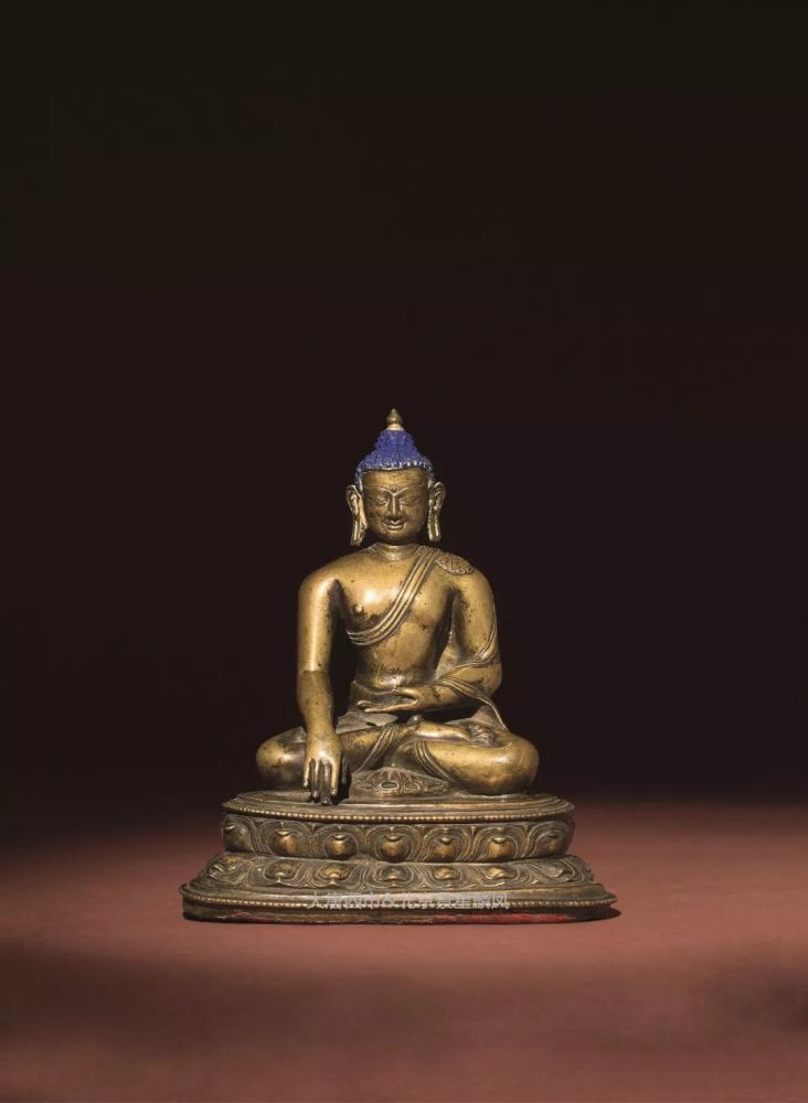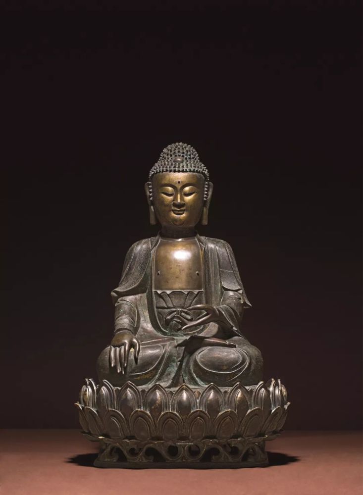 释迦族的修行成就者,释迦牟尼,在将近而立之年出家,在访遍名师仍无法得道,于是到苦行林中苦修六年,却仍无法得道解脱,于是再转而前往菩提伽耶,坐于菩提树下禅定并发下誓愿,不成正觉永不起身,在过了七天七夜后,仰望明星而证得无上正等正觉,佛陀悟道后即从鹿野苑开始传道,为佛教发展成世界三大宗教之一的起始。释迦牟尼佛悟道的成道像,是目前流传最广泛的佛陀造像形式,成道之姿,左手于腹前结禅定印,右手结触地印,自此释迦牟尼证道成佛,此尊佛陀头部螺结高耸,矿物彩绀蓝明亮,挽髻于,宝珠顶严。面相方圆,神态安然,眉间饰白毫,目光下收,隐含威仪,眉与鼻梁成一线,鼻挺嘴巧,耳长垂肩,脖环数痕,身着袒右肩式袈裟,衣饰简洁,仅衣缘饰两道线纹,薄衣如蝉翼贴体呈现,惚间,笈多王朝之风再现。佛像身挺厚实,肩部线条浑圆结实,肩宽腰缩,端坐于双层仰覆莲花座之上,莲座上下边缘均饰以连珠,莲瓣厚实饱满,瓣尖排列整齐且微翘,庄严形象自然成型,不怒自威,不言自明,明了一切众生皆有如来智慧德相,佛性本,人人皆当成佛,皆能证得无上正觉。由此近观工艺之美,不仅成道之姿生动传神,铜质细腻之外,更体现出元代特有的合金铜造像风貌。