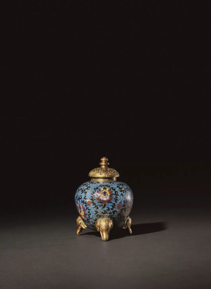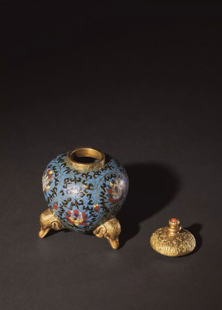 三足炉铜胎,采用掐丝珐琅工艺,尽显雍容华丽。器分炉盖、炉身两部分,束颈,丰肩,圆鼓腹,腹以三个鎏金象首为足。盖顶高隆,瓜形钮,钮上嵌饰粉色宝石。盖面镂空,间饰六朵灵芝纹。炉身以蓝色珐琅为地,掐丝工艺装饰缠枝莲纹,叶如飞鸟,花朵似升腾的火焰。整器造型庄重大方,风格古朴典雅,掐丝规整,金水灿灿,体现了掐丝珐琅工艺的鲜明特点。