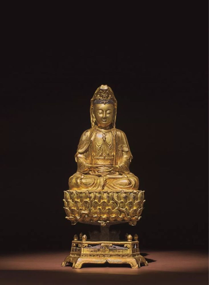 此尊观音全跏趺端坐于莲座中间,双手结禅定印置双膝上。整体造像概分像身、莲台及底座三段式。像身头梳高髻,顶覆披巾垂覆双肩,髻前安化阿弥陀佛。面形圆润,双目低垂,嘴角微扬,神态宁静安详。上身着垂领袈裟,衣缘刻缠枝花纹,胸前饰珠串璎珞,长裙包裹下身仅露足底盘于膝上,衣纹流动,隐约透出躯体肌理结构,生动自然。下为四层莲花座以柱台支撑于空中,增添造像的神圣气氛。莲瓣饱满,瓣尖微向外下卷,增添生动之感。整体造型略显修长,庄严大方、作工精细,为明代中晚期的流行风格,三段式保持完整,为难得的传世佳作。