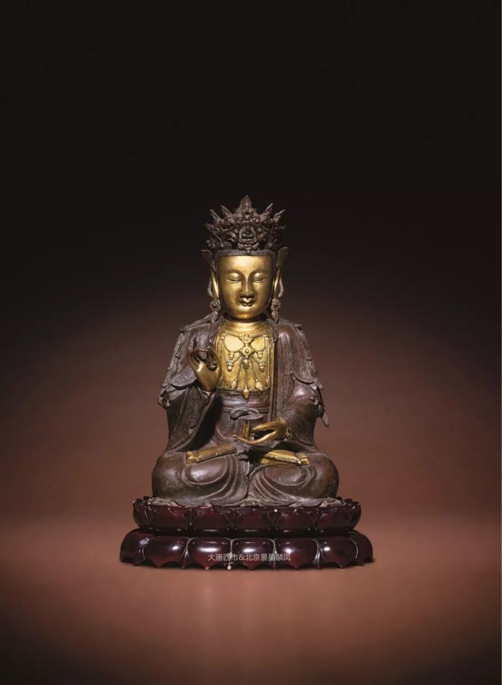 此尊头戴峨冠,正中饰化佛,宝缯飘拂于耳际,宽额丰颐,双目垂俯,仪态慈悲庄严,身着通肩衲衣,佩戴璎珞钏环,衣着边缘錾刻缠枝花卉,右手持杨柳枝,左手托净水盂,全跏趺于红木仰覆莲座之上。此像身肌肤处鎏金,余处呈古铜色,头部比例较大,时代特征明显,当为明代汉传佛教造像中的精妙之作,殊为难得,当为藏家珍之。
