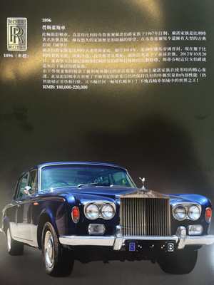 在即将于6月底在申城举行的一场拍卖会上,将推出一辆劳斯莱斯银影轿车,为当时比利时布鲁塞尔兰诺伯爵家族于1967年订制。由于劳斯莱斯的精湛工艺和产品质量,再加上兰诺家族在使用时的精心养护,此量银影轿车在经历了半个世纪的沧桑后仍然保持良好的外观质量和内部性能,这辆车的估价为18万至25万元,也就是说,如果没有人和你竞争的话,只要花18万元,加上支付给拍卖行的佣金,就可以买到一辆劳斯莱斯了。