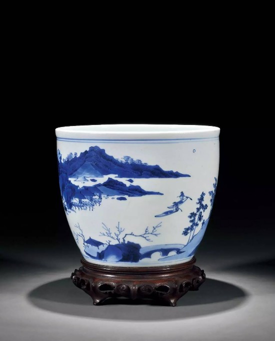 明崇祯 青花山水人物纹缸 直径 D 21.2cm 带座