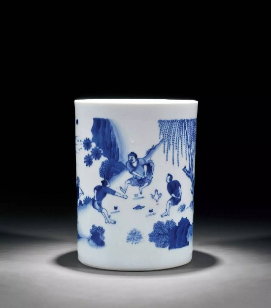 明崇祯 青花渔家乐人物纹笔筒 高 H 19.8cm