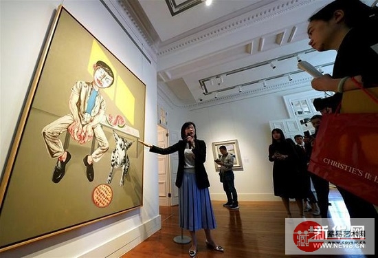 工作人员正在介绍预展的油画拍品《面具》。