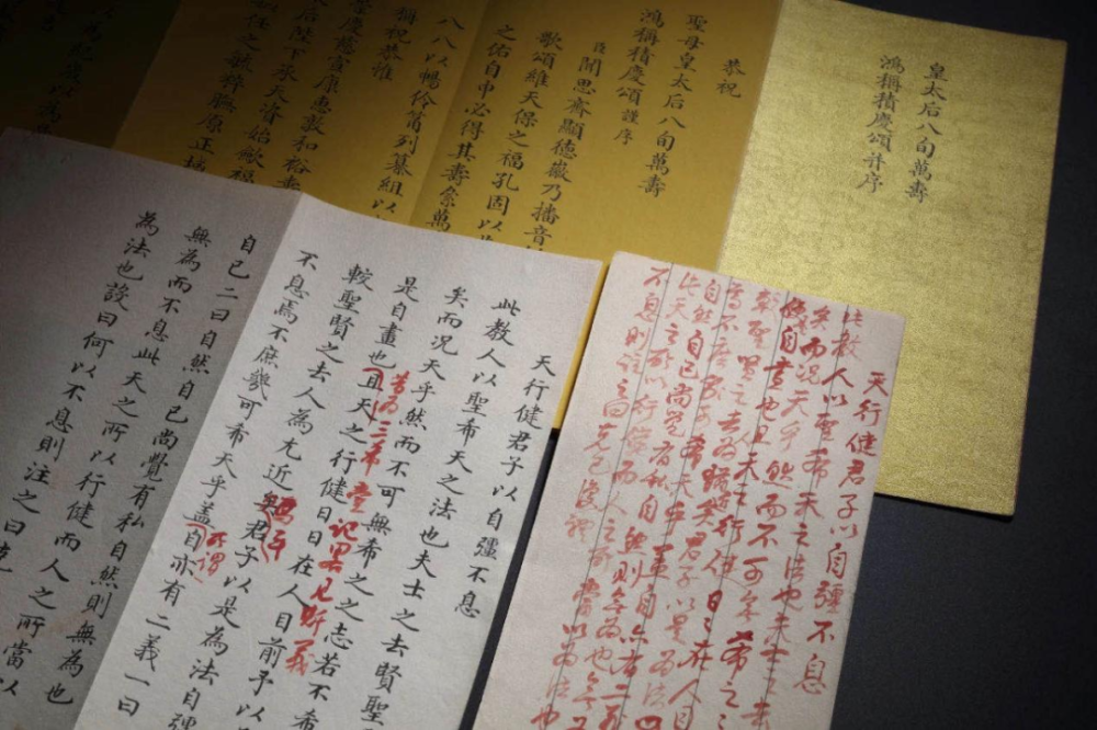 本次展出的《乾隆御制诗文稿》,包括六十四纸和一本崇庆皇太后八旬万寿祝寿颂词册页。它作为信史见证物,是乾隆帝的诗文理想和家国理念的珍贵呈现。它是北京故宫博物院以外,首现的私人珍藏最大宗乾隆御制诗文稿,具有重要的清宫档案文献史料价值,同时也补充了乾隆御制诗文稿的整体风貌。特别是祝寿颂词册页,亦乾隆以“孝”治天下的一种见证。