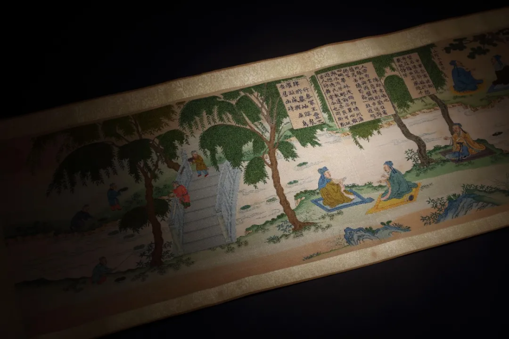 乾隆时期《钦定补刻端石兰亭图帖缂丝全卷》被誉为“缂丝之王”,全卷长约1715厘米,宽约32厘米,共60个人物、9162字,是乾隆皇帝一生浩瀚“兰亭文化工程”的巅峰之作,也是中国历史上“兰亭”主题的集大成之作。