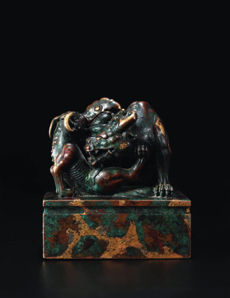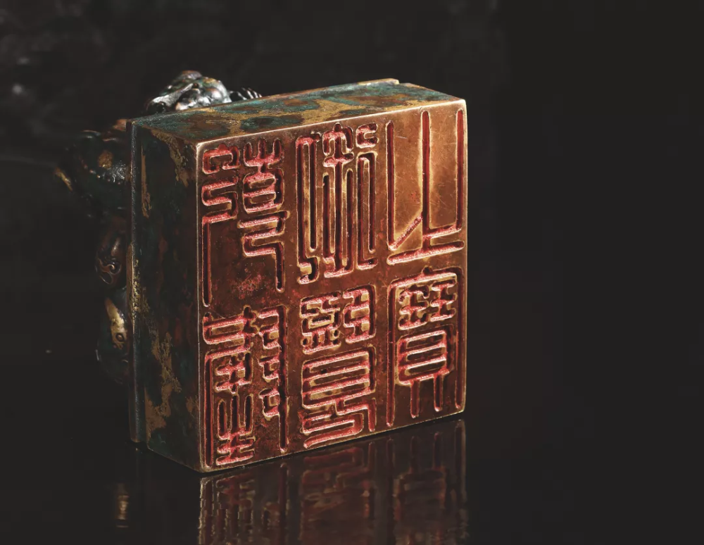 铜点金异兽钮“乾隆御览之宝”,此印制于乾隆三年,代表着年轻弘历的古雅品味,亦是乾隆一生最为重要的书画鉴藏印。此宝玺曾创造北京保利拍卖纪录,重约3.8公斤,是乾隆唯一铜制玺印,合金仿古铜又鎏金,象征着金石永年、江山永固。