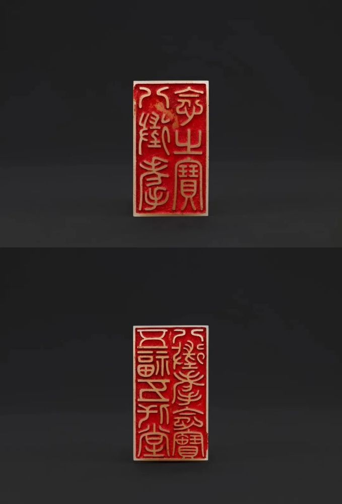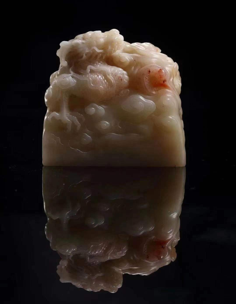 寿山芙蓉苍龙教子钮“古希天子之宝”,是首次露面、非常重要的私人收藏,它的材质是福建寿山石里面的白芙蓉,内容是“古希天子之宝”。“古希(稀)”来源于杜甫的诗句,”人生七十古来稀”,乾隆皇帝列举了六位皇帝,也说自己是多福之人,但是要犹日孜孜,还要继续勤政。此印是乾隆七十大寿时所制,以勉励自己不可怠政,是其恪守“勤政”祖训的见证。
