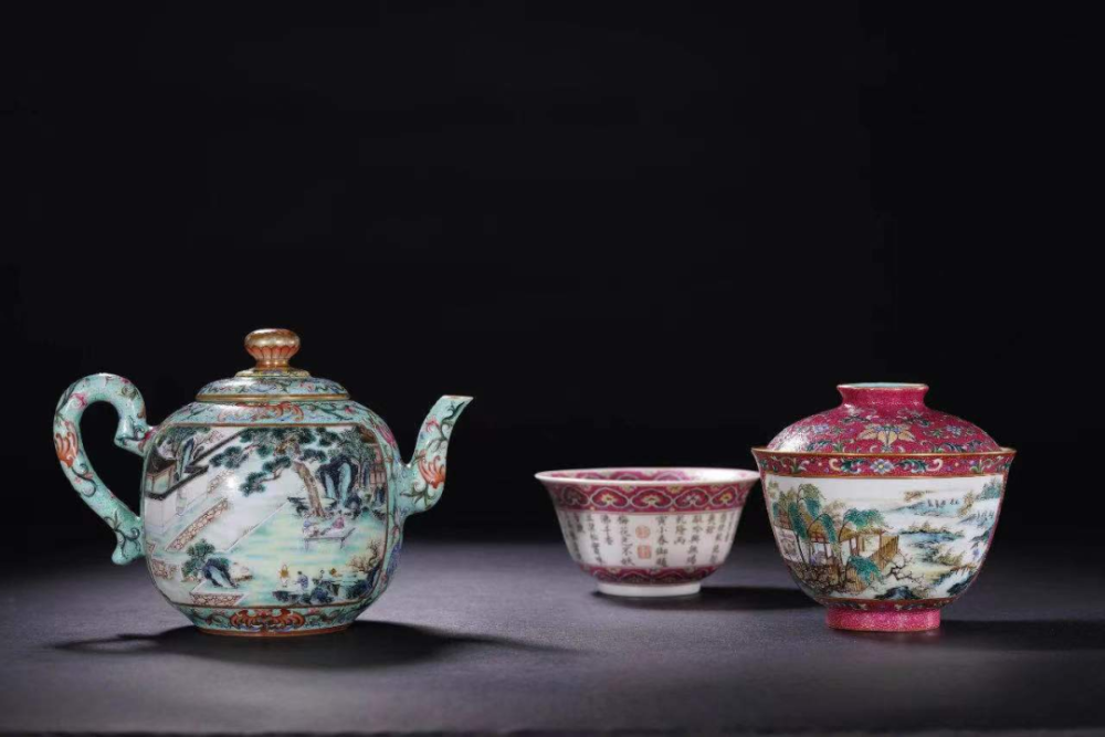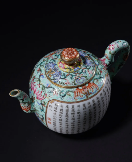 清乾隆 洋彩轧道描金松石绿地开光御制诗“惠山煮泉观卷图”茶壶,以茶为题,绮丽致美,壶身开光,正面以松庵为题,绘一清洒高仕,案前赏卷,伴有童子二人,一人奉茶,一人烹茶。背面开光内题墨书乾隆十六年(1751年)作〈汲惠泉烹竹垆歌〉御制诗一首,收录在《清高宗御制诗文全集·御制诗二集》中。
